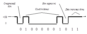 по інтерфейсу RS-232C, необхідно ввести додаткові біти, котрі вказують на початок і кінець пакету. Крім того, бажано додати зайвий біт для простого контролю помилок по паритету (парність).