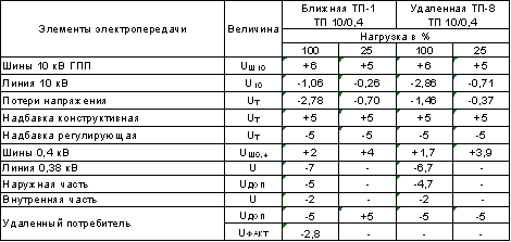 Для ТП 8 определены только электрические нагрузки подстанции, питающей ответственные потребители.На этих ТП выбраны конденсаторные батареидля повышения коэффициента мощности (cosφ), а затем поэкономическим интервалам нагрузок выбраны номинальные мощностисиловых трансформаторов для всехвосьми ТП. В линии 10 кВ рассчитаны по участкам электрическихнагрузкок и выбранысечения проводов. По таблицеотклоненийнапряженияопределяется положения регуляторовПБВ на трансформаторах 10/0,4кВ, и допустимаяпотеря напряжения в линиях 0,38 кВ,