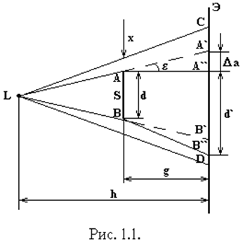 Пусть световой луч LA испытывает при прохождении через оптическую неоднородность отклонение на угол e (рис. 1.1). Вследствие этого он попадает не в точку А`, а в точку А``, которая удалена от А` на расстояние Dа=g×tge. Но так как угол e мал (а только такие случаи и имеет смысл исследовать теневым методом), то tge@e, и поэтому