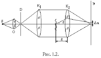 Свет от источника S проходит через конденсорную линзу О, диафрагму D и между линзами K1