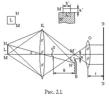Источник света L представляет собой равномерно ярко светящуюся площадку MN, ограниченную по линии М прямолинейным краем. В верхней части рис. 2.1 слева приведен вид источника света L по направлению оптической оси. Длиннофокусный объектив К, исправленный на сферическую и хроматическую аберрации, создает в плоскости М`N` изображение источника L`. Диаметр объектива К должен быть больше размеров исследуемой неоднородности, которая помещается на пути света между объективом К и плоскостью М`N`. Острый край ножа Фуко должен располагаться строго параллельно прямолинейному краю изображения источника света. В верхней части рис. 2.1 справа приведено относительное расположение диафрагмы В и изображения источника света L`. Ширина незакрытой части изображения источника света обозначена через а`. Объектив О дает изображение объектов, находящихся в плоскости исследуемой шлиры S, на экране Э. Соответствующим подбором объектива О можно в известных пределах изменять размер изображения объектов на экране Э и выбрать подходящую для каждого случая освещенность. Обозначения расстояний между различными деталями установки приведено на рис. 2.1.