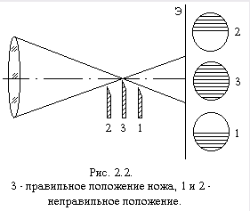 Рассмотрим приемы определения правильного положения диафрагмы с одним острым прямолинейным краем (ножа Фуко) при применении в качестве источника света ярко освещенного прямоугольника. Наиболее универсальным является следующий способ. После определения приблизительного положения диафрагмы начинают вдвигать (с помощью микрометрического винта) нож перпендикулярно оптической оси с одной какой-нибудь стороны (рис. 2.2). Вероятно, поле на экране при этом начинает темнеть с одной стороны. Если на экране тень будет надвигаться с той же стороны, что и нож, то это значит, что диафрагма находится между плоскостью изображения источника света и экраном (положение 1 на рис. 2.2). Поэтому диафрагму следует поставить дальше от экрана. Если в новом положении диафрагмы, при ее вдвигании тень будет надвигаться в направлении, противоположном движению диафрагмы, то это означает, что диафрагма находится между плоскостью изображения источника света и объективом, следовательно, ее надо поставить подальше от объектива. Повторяя далее эти операции, можно установить диафрагму точно в плоскости изображения источника света. В этом случае, при диафрагмировании изображения источника света, поле на экране будет темнеть равномерно во всех точках. Возможные при этом неравномерности в освещенности поля на экране могут быть вызваны только недостатками объектива. Можно для правильной установки ножа рекомендовать другой способ. Вблизи изображения источника света (между ним и экраном) устанавливают лупу, которая проектирует увеличенное изображение источника света и края диафрагмы на какой-нибудь экран. Перемещая лупу вдоль оптической оси системы, добиваются резкого изображения на экране источника света. Закрывая далее ножом приблизительно половину изображения источника света и передвигая нож вдоль оптической оси, добиваются резкого изображения острого края диафрагмы (ножа) на экране, что означает, что диафрагма находится в плоскости изображения источника света. Так как изображения прямолинейного края диафрагмы и источника света на экране получаются увеличенными, то, наблюдая взаимное расположение края ножа и изображения источника света на экране и, поворачивая нож в его плоскости вокруг оптической оси, легко установить параллельность прямолинейного края диафрагмы и прямолинейного края изображения источника света. Так же, как и при первом способе, необходимо, чтобы на пути лучей не было оптических неоднородностей и посторонних предметов, так как это ведет к размытости краев изображения источника света. Описанный прием удобен тем, что изображение на экране можно получить значительно увеличенным и одновременно контролировать наличие зазубрин и пылинок на прямолинейном краю диафрагмы и на краях источника света и равномерную освещенность поверхности источника света.