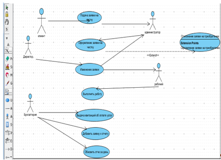 На данном этапе курсового проектирования мы добавили 5 актеров: «клиент», «администратор», «бухгалтерия», «рабочий» и «директор». Также добавили 8 действий Use Case: «подача заявки на чистку», «оформление заявки на чистку», «изменение заявки», «выполнить работу», «выдача квитанций об оплате услуг», «добавить заявку к отчету», «обновить отчет за день»,«отклонить заявку на чистку», последнее является как раз расширение. На данном рисунке видно, что актеры взаимодействуют с действиями (вариантами использования). Каждый Актер порождает взаимодействия. Все взаимодействия представлены на рисунке.