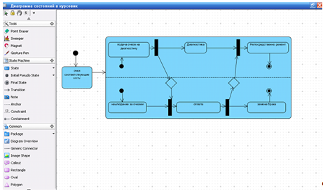 . На рисунке, видно, что когда механик получает заказ, он проверяет наличие автомобиля на СТО, а в это же время (параллельно) бухгалтерия выдает квитанцию на оплату. Если операция не оплачена, то механик не производит ремонт, если же деньги поступили, механику поступает заявка на ремонт. Он в свою очередь, если свободен, то приступает к работе немедленно, либо, если занят, то ставит данную заявку в очередь. Смысл диаграммы сводится к тому, чтобы показать какие процессы происходят параллельно друг другу, и показать какие варианты исхода могут быть.