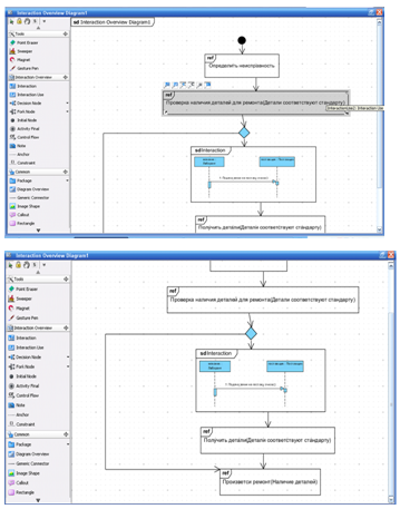Для создания диаграммы взаимодействия были использованы теги (ref и sd), созданные в Sequence diagram. Если при проверке наличия деталей выясняется, что у нас есть детали, то переходим к конечному этапу – «произвести ремонт». А если деталей нет, тогда переходим к этапу заказа и получения деталей.