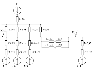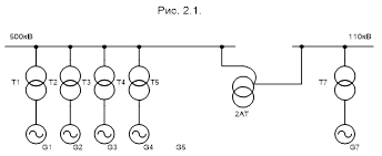 В первом варианте рисунок 2.1 к шинам высокого напряжения 500кВ присоединено четыре генератора ТГВ-500–2У3 через блоки. К шинам среднего напряжения 110кВ присоединен через блок генератор ТГВ-200–2У3. Во втором варианте рисунок 2.2 к шинам высокого напряжения 500кВ присоединено 3 генератора ТГВ-500–2У3 через блоки. К шинам среднего напряжения 110кВ присоединены через блоки генератор ТГВ-500–2У3 и генераторТГВ-200–2У3.