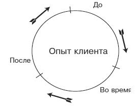 Предназначение такого разделения становится понятным по мере того, как вы упоминаете этапы продвижения клиента по кругу, а затем указываете виды действий, которые выполняете для того, чтобы увеличить ценность опыта клиента. Существует большая вероятность того, что вы сможете составить очень полную картину того, что происходит «на позднем этапе «до» (когда клиент говорит с вами и подумывает о размещении заказа) до «среднего этапа «во время» (ваш продукт купили и начали его использовать). Возможно, у вас смутное видение того, что происходит «на раннем этапе «до» и на «позднем этапе «во время», и, скорее всего, вы плохо представляете себе этап «после». Именно эти белые пятна и скрывают множество возможностей для получения конкурентного преимущества.