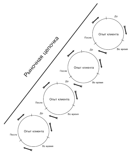 Всегда старайтесь составить карту цепочки увеличения ценности в процессе, который проходит ваш клиент, с наиболее раннего до наиболее позднего возможного этапа. Во многих случаях и удобным, и показательным является разделение цепочки увеличения ценности на три части: до, во время и после (рис. 1). Изображение цепочки в виде кольца, а не в виде линейной таблицы, возможно, является более подходящим, потому что напоминает нам, что это не одноразовое действие. Мы хотим, чтобы клиенты возвращались к нам и снова и «До» относится ко всем видам деятельности, которые выполняются до того, как клиент непосредственно будет привлечен к покупке и использованию вашего продукта или услуги. Сюда входит генерирование идей, идентификация потребностей, процесс выбора, рейтинг поставщиков, пробные покупки, переговоры с поставщиками и покупка снова проходили по тому же кругу.