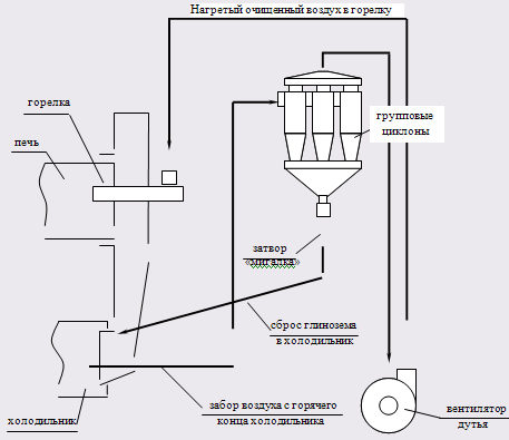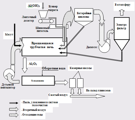 Материал интенсивно выносится из печи отходящими газами. Пылеунос составляет обычно от 100 до 200% от производительности печи, поэтому газы проходят через систему газоочистки: батарейные циклоны и вертикальные электрофильтры, центробежный пылеуловитель, циклоны и горизонтальный электрофильтр. Уловленная пыль возвращается в печь. Прокаленный глинозем охлаждается в холодильниках воздухом и водой до температуры, пригодной для его дальнейшей транспортировки, складирования и отгрузки потребителям. Нагретый в холодильнике воздух подается в печь на горение топлива. Использование предварительно нагретого воздуха для сжигания мазута, а также тепла отходящих из печи газов для сушки гидрата, позволяет сократить удельный расход топлива и повысить производительность печи.