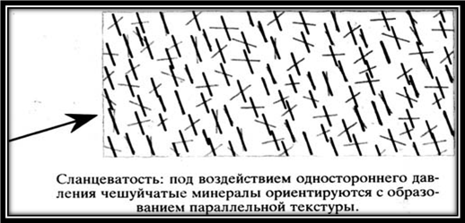 В условиях одностороннего давления создаются благоприятные условия для развития минералов, вытянутых в одном или двух направлениях, а также для их упорядоченной переориентации в горных породах. В результате образуется сланцеватый виды текстур - при однообразной ориентировке пластинчатых или удлиненных зерен (рис.2).