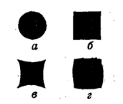 Рис. 1. Основные формы растровых точек: а – круглая; б – квадратная; в – ромбоподобная; г - бочкоподобная