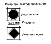 Казалось бы, чем большей является частота растра, тем лучшим будет воспроизведение. Однако это справедливо только в определенный период, поскольку во время копирования и печатания проходят изменения степени покрытия поверхности. Это показано на рис. 7, на котором края с маленькой оптической плотностью одинаковой ширины для обоих частот растра относительно растра с большей частотой дают больший прирост степени покрытия поверхности. Учитывая это, при офсетном способе печати применяют растры с частотой максимум 60 линий/см. При использовании растров большей частоты есть большая опасность появления искажений во время копирования и печати и необходимо строже придерживаться правил копирования и печати, чтобы исключить факторы, которые приводят к изменению размеров растровых точек.