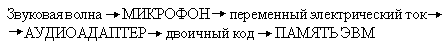 Процесс преобразования звуковых волн в двоичный код в памяти компьютера: