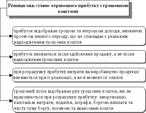 Однією з причин такої ситуації є специфіка відображення інформації в звітності про фінансові результати, яка полягає у використанні методу нарахувань та відповідності доходів і витрат. Інформація про потоки грошових коштів формується за касовим методом, тобто за фактом їх руху на рахунках в банку і в касі підприємства. Результатом використання різних методів формування інформації є невідповідність реального потоку грошових коштів і прибутку, відображеного у звітності (рис. 5).