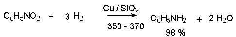 Эта реакция была открыта в 1842 году Н.Н.Зининым, который впервые восстановил нитробензол до анилина действием сульфида аммония. В настоящее время для восстановления нитрогруппы в аренах до аминогруппы в промышленных условиях применяется каталитическое гидрирование. В качестве катализатора используют медь на силикагеле в качестве носителя. Катализатор готовят нанесением карбоната меди из суспензии в растворе силиката натрия и последующим восстановлением водородом при нагревании. Выход анилина над этим катализатором составляет 98 %.