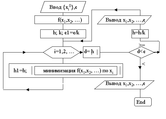 Блок-схема поиска минимума функции двух переменных методом покоординатного спуска.