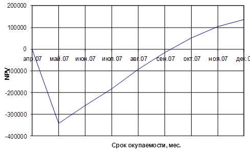 Данная таблица представляет собой сводный денежный поток, состоящий из 3-х потоков: инвестиционного, операционного и финансового профиля проекта. В этой таблице рассчитаны главные показатели. Итоговой строчкой представлен дисконтированный денежный поток с нарастающим итогом. Срок окупаемости проекта наступит в сентябре 2007 года.