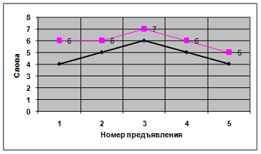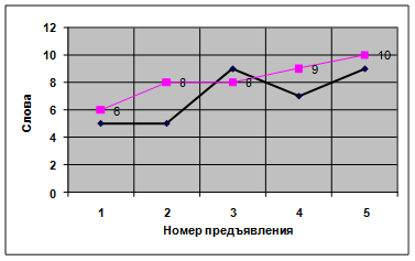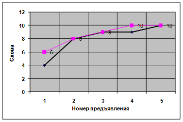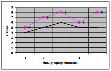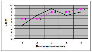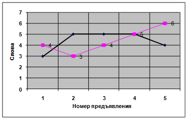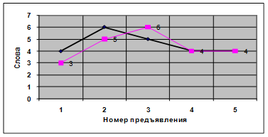 «10 слов» - данные первого предъявления (нижний график) говорят об истощаемости, отвлекаемости (привнесение новых слов - лед, стук) и о дефицитарности объема актуальной информации, которая должна быть удержана.