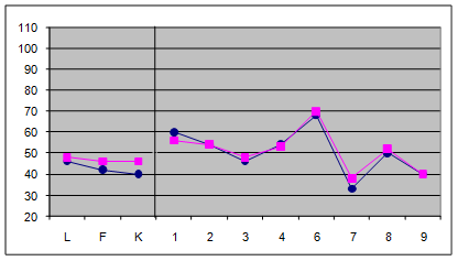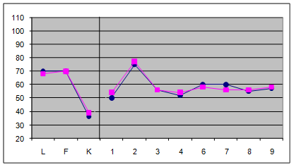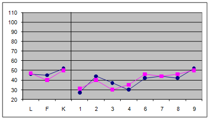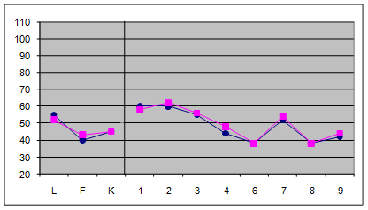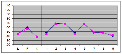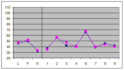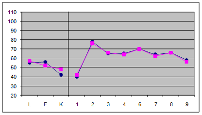 Снижение по 9 шкале говорит об особенно глубокой депрессивной окраске настроения. Повышение на общем фоне профиля 6 и 8 шкал может говорить о неявно выраженной агрессии по отношению к окружающим, обвинительной позиции, в то время как позиция других незначима. После проведения психотерапии наблюдается повышение профиля по 6 и 8 шкалам, в целом незначительные.
