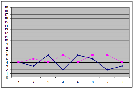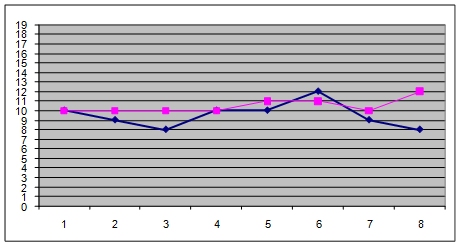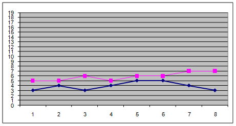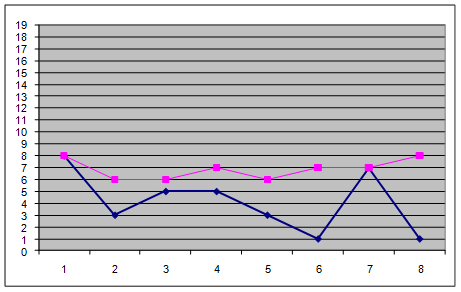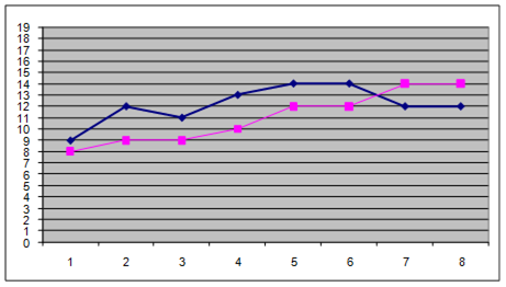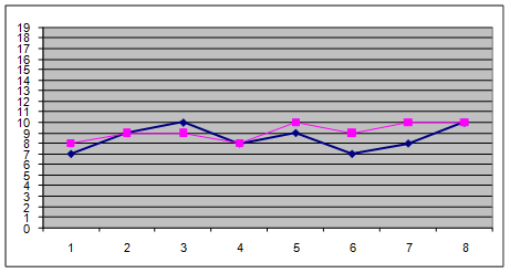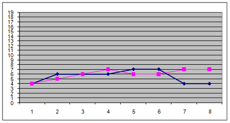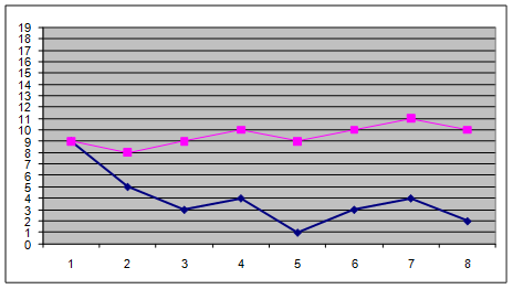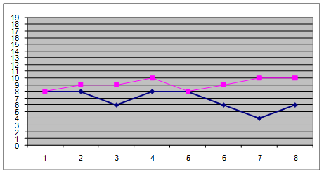 Методика “Таблицы Шульте” – время работы с таблицами при первичном исследовании от 50 до 115сек., при повторном – от 40 до 65сек. Изменение темпа сенсомоторных реакций в сторону ускорения, что говорит о повышении врабатываемости, повышение скорости переключения внимания, неравномерность распределения активного внимания без изменений.