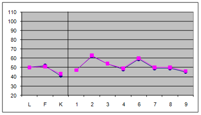 Методика СМИЛ. Профиль нормативный, достоверный – 5:4:2, выявляется усиление нормативного поведения (L=55). В качестве ведущего пика в профиле выступает 2 шкала (77Т), что показывает депрессивную реакцию в рамках адаптационного синдрома, обусловленную заболеванием. В частности неуверенность в себе, пассивность. Незначительное повышение по 6 шкале отражает наличие подавляемой (заниженная 1 шкала) раздражительности, враждебности. Общая биологическая и психологическая тенденция противодействия чему-то инородному, чужому как для духовного мира личности, так и для физиологического мира организма. Значительных изменений после психотерапии не выявлено.