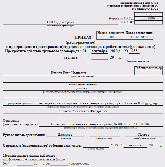 20 октября текущего года дворник ООО "Домстрой" Иванов призван на военную службу. Определите основание прекращения трудового договора. Оформите приказ (распоряжение) о прекращении (расторжении) трудового договора с работником (увольнении) Т-8. Внесите запись об увольнении в трудовую книжку работника. Иванов призван на военную службу 20 октября текущего года, таким образом последним его рабочим днем будем считать 19 октября 2010 года (в день призыва он уже не исполнял обязанности дворника). Призыв работника на военную службу является обстоятельством, не зависящим от воли сторон трудового договора. При увольнении по этому обстоятельству необходимо руководствоваться статьей 83 Трудового кодекса. Заполнение трудовой книжки выполним в соответствии с п.п. 5.1. и 5.4. Инструкции по заполнению трудовых книжек, утвержденную постановлением Минтруда РФ от 10 октября 2003 г. N 69: