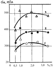 Влияние Ti на прочность сплавов системы Be–Ni–Ti при 20 °С и в зависимости от содержания Ni: 1 – 4%; 2 – 6%; 3 – 8% (по И.Н. Фридляндеру)