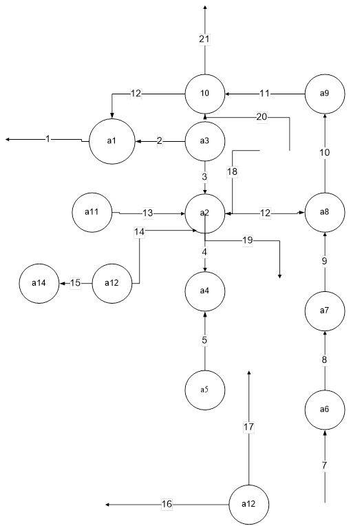 Схема циркуляционной маслосистемы, рисунок 2 (регулированное давление масла): 1. Маслобак; 2. магистраль всасывающая; 3. нагнетающий маслонасос; 4. Фильтр тонкой очистки; 5. клапан редукционный; 6. датчик замеров давления; 7. Откачивающие маслонасосы; 8. Откачивающая магистраль; 9. Воздухоотделитель центробежный; 10. Теплообменник; 11. Полости (масляные) двигателя; 12. Суфлирующая магистраль. 13. суфлер центробежный; 14. клапан баростатический; 15. Клапан обратный; 16. Заборник масла маятниковый; 17. Воздухоотделитель статический; 18. Клапан перепускной.