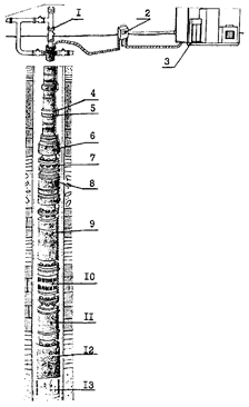 Струйный насос (рис. 13) приводится в действие под влиянием напора рабочей жидкости (лучше нефти или воды), нагнетаемой в НКТ 1, соединенные с соплом 2. При прохождении узкого сечения сопла струя перед диффузором 4 приобретает большую скорость и поэтому в каналах 3 снижается давление. Эти каналы соединены через полость насоса 5 с подпакерным пространством 6 и пластом, откуда пластовая жидкость всасывается в насос и смешивается в камере смешения с рабочей. Смесь жидкостей далее движется по кольцевому пространству насоса и поднимается на поверхность по межтрубному пространству (насос спускают на двух концентрических рядах труб) под давлением нагнетаемой в НКТ рабочей жидкости. Насос может откачивать высоковязкие жидкости и эксплуатироваться в сложнейших условиях (высокие температуры пластовой жидкости, содержание значительного количества свободного газа и песка в продукции и т.д.).По данным НИПИ Гипроморнефтегаз срок службы струйного насоса в абразивной среде не менее 8 мес., теоретический отбор жидкости до 4000 м3