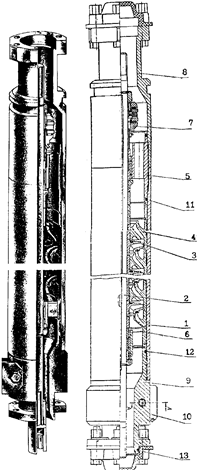 Рис. 10. Устьевая арматура типа АУЭ: 1 - перепускной клапан; 2 - манжета; 3 - уплотнение кабеля; 4 ‑ пробковый кран; 5 ‑ патрубок; 6 - зажимная гайка; 7 ‑ трубная подвеска; 8 - корпус; 9,12,13 - угловые вентили; 10 ‑ отборник проб, 11 - быстросъемное соединение
