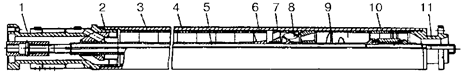 Рис. 5. Газосепаратор: 1 – головка; 2 – переводник; 3 – сепаратор; 4 – корпус; 5 – вал; 6 – решетка; 7 ‑ направляющий аппарат; 8 – рабочее колесо; 9 – шнек; 10 – подшипник; 11 ‑ основание