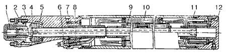 Рис. 6. Электродвигатель серии ПЭДУ: 1 – соединительная муфта; 2 – крышка; 3 – головка; 4 – пятка; 5 – подпятник; 6 ‑ крышка кабельного ввода; 7 – пробка; 8 – колодка кабельного ввода; 9 – ротор; 10 – статор; 11 – фильтр; 12 – основание