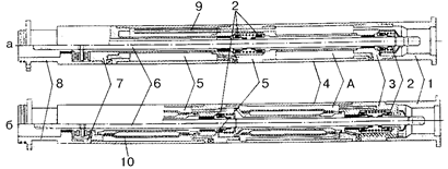 Рис. 7. Гидрозащита: а – открытого типа; б – закрытого типа;А – верхняя камера; Б – нижняя камера;1 – головка; 2 – торцевое уплотнение; 3 – верхний ниппель; 4 – корпус; 5 – средний ниппель; 6 – вал; 7 – нижний ниппель; 8 – основание; 9 ‑ соединительная трубка; 10 – диафрагма
