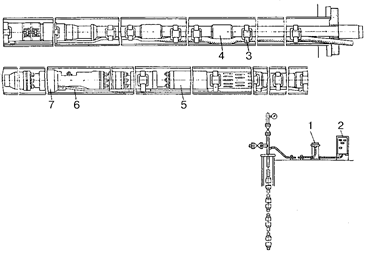Рис. 8. Установки погружного винтового сдвоенного электронасоса: 1 – трансформатор; 2 – комплектное устройство; 3 ‑ пояс крепления кабелей; 4 ‑ насосно‑компрессорная труба; 5 – винтовой насос; 6 – кабельный ввод; 7 – электродвигатель с гидрозащитой