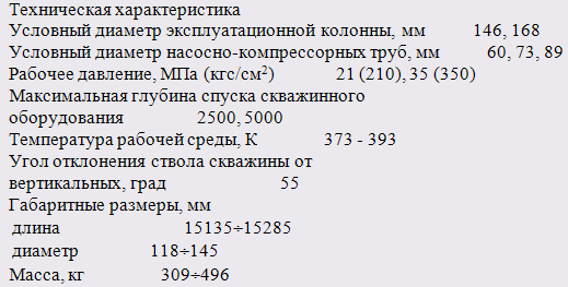 Наиболее широко применяются газлифтные установки ЛН рассчитаны на рабочее давление 21 и 35 МПа, максимальную глубину спуска скважинного оборудования - 5000 м, температуру скважинной среды до 120°С и имеют массу от 185 до 585 кг.