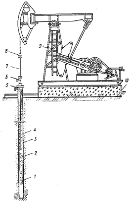 Штанговая глубинная насосная установка (рис. 1) состоит из скважинного насоса 2 вставного или невставного типов, насосных штанг 4, насосно-компрессорных труб 3, подвешенных на планшайбе или в трубной подвеске 8 устьевой арматуры, сальникового уплотнения 6, сальникового штока 7, станка качалки 9, фундамента 10 и тройника 5. На приеме скважинного насоса устанавливается защитное приспособление в виде газового или песочного фильтра 1.
