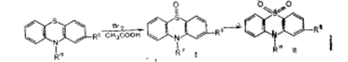 Окисление фенотиазина или его производных бромом в уксусной кислоте или другим окислителем, например перекисью водорода, приводит к образованию S-оксида (I) и диоксида-сульфона (II).