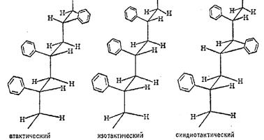 Свойства атактического и изотактического полимеров различаются весьма существенно. Атактический полимер можно формовать при значительно более низких температурах, и он растворим в большинстве растворителей намного лучше изотактического. Этот термин означает, что если ориентировать углеродные атомы полимерной цепи, придав ей, правильную зигзагообразную форму, то фенильные боковые группы окажутся распределенными случайным образом по одну и по другую сторону вдоль цепи (как это показано на рисунке