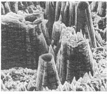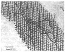 Объекты исследования в Э. м.— обычно тв. тела. В просвечивающих МЭ (ПЭМ) эл-ны с энергиями от 1 кэВ до 5 МэВ проходят сквозь объект, поэтому изучаются образцы в виде тонких плёнок, фольги (рис. 1), срезов и т. п. толщиной от 1 нм до 10 мкм (от 10 A до 105 A). Микрокристаллы, порошки, аэрозоли и т. п. можно изучать, нанеся их предварительно на подложку: тонкую плёнку для исследования в ПЭМ или массивную подложку для исследования в растровых МЭ (РЭМ). Поверхностную и приповерхностную структуру массивных тел толщиной существенно больше 1 мкм исследуют с помощью РЭМ (рис. 2), отражательных, зеркальных МЭ, ионных проекторов и электронных проекторов. Поверхностная геом. структура массивных тел изучается также и методом реплик: с поверхности такого тела снимается отпечаток в виде тонкой плёнки углерода, коллодия, формвара и т. п., повторяющий рельеф поверхности и рассматриваемый в ПЭМ. Обычно предварительно на реплику в вакууме напыляется под скользящим (малым к поверхности) углом слой сильно рассеивающего эл-ны тяжёлого металла (напр., Pt), оттеняющий выступы и впадины геом. рельефа — т. н. метод декорирования. Этот метод позволяет исследовать не только геом. структуры поверхностей, но и микрополя, обусловленные дислокациями (рис. 3), скоплениями точечных дефектов (см. ДЕФЕКТЫ В КРИСТАЛЛАХ), ступенями роста крист. граней, доменной структурой (см. ДОМЕНЫ) и т. д. В этом случае на поверхность образца вначале напыляется очень тонкий слой декорирующих ч-ц (атомы Au, Pt, молекулы полупроводников или диэлектриков), осаждающихся преим. на участках сосредоточения микрополей, а затем снимается реплика с включениями декорирующих ч-ц.