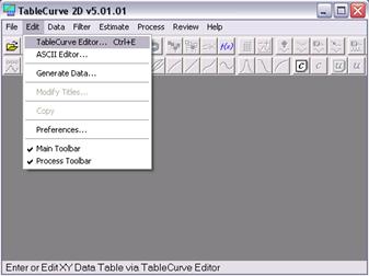 На рис. 5 показано меню программы Table Curve. Это меню появляется сразу после открытия программы. Теперь необходимо «щелкнуть» на строчке «TableCurve Editor» (редактор). Окно редактора программы показано на рис. 6.
