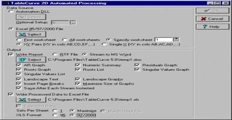 TableCurve 2D автоматически генерирует вывод для каждого набора данных. Вывод может быть написана на MS Word (RTF или родовым) файл для всех графиков и числовых резюме и MS Excel для числовых данных.