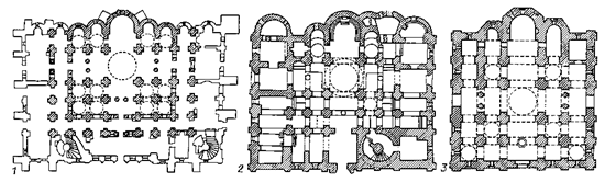 Рис.2 Планы Софийских соборов: 1 - в Киеве (1037), 2 - в Новгороде (1045-50), 3 - в Полоцке (1044-66).