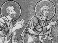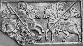 Рис.5 "Св. Нестор и Дмитрий". Рельеф с фасада собора Михайловского монастыря в Киеве. Шифер.11в. Третьяковская галерея. Москва.