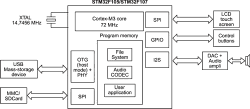 Самым простым примером использования STM32F в области звуковых приложений является создание комплексного аудиопроигрывателя с возможностью чтения аудиопотока с USB Flash-носителей и карт памяти, поддержкой HMI (human machine interface) в виде сенсорных экранов и/или кнопочных устройств ввода и с выводом информации по шине I2S прямо в ЦАП (рис. 1) [1].