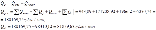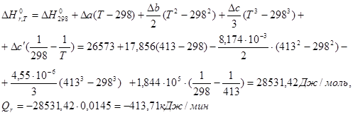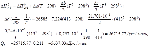 Из расчета материального баланса видно, что процесс подчиняется закону сохранения массы. Выход продукта невелик, т.к. имеются потери из-за неполного превращения исходных веществ. Определение тепловой нагрузки на реактор показало, что тепловой баланс подчиняется закону сохранения энергии. Реакция эндотермическая, QF > 0, то есть для поддержания заданной температуры химической реакции необходимо подводить тепло в количестве 180169,75 кДж/мин. С учетом тепловой нагрузки поверхность теплообмена равна 151,59 м2.