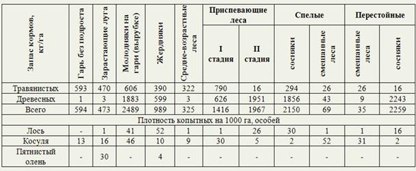 Таблица 2. Влияние сукцессий на видовой состав и плотность копытных в лесных биогеоценозах