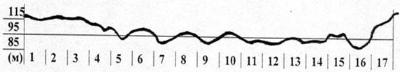 1 - коренной берег, сосново-еловые леса; 2 - болото; 3 - сосново-еловые леса с вырубками и посадками; 4 - болото–сосняки; 5 - речки, протоки; 6 - елово-широколиственные леса; 7 - старицы, озёра; 8 - луга; 9 - русло; 10 - широколиственные леса; 11 - старицы; 12 - протоки; 13 - ивняки, луга; 14 - луга; 15 - наносы на бывшем русле, лиственные и широколиственные леса; 16 - русло; 17 - коренной берег