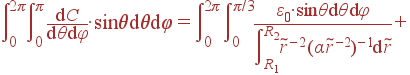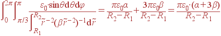 Задача. Часть сферического конденсатора (область θ<π/3) заполнена диэлектриком с проницаемостью ε(r) = α/r2, а остальная часть имеет ε(r) = β/r2. Найти емкость, если радиусы обкладок R1 и R2.