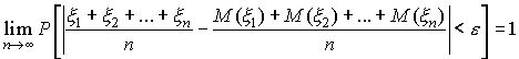 Закон больших чисел Чебышева. Имеет место, следующее утверждение. Пусть последовательность попарно независимых случайных величин, имеющих ограниченные в совокупности дисперсии, т.е. для любого i. Тогда, каково бы нибыло, ε>0 справедливо соотношение