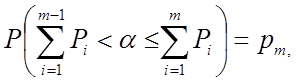 Надо определить промежуток или интервал в который попадает случайная величина α.Пусть номер этого промежутка или интервала равно m. Если этот номер равно m, то ξ пнимет значение хm